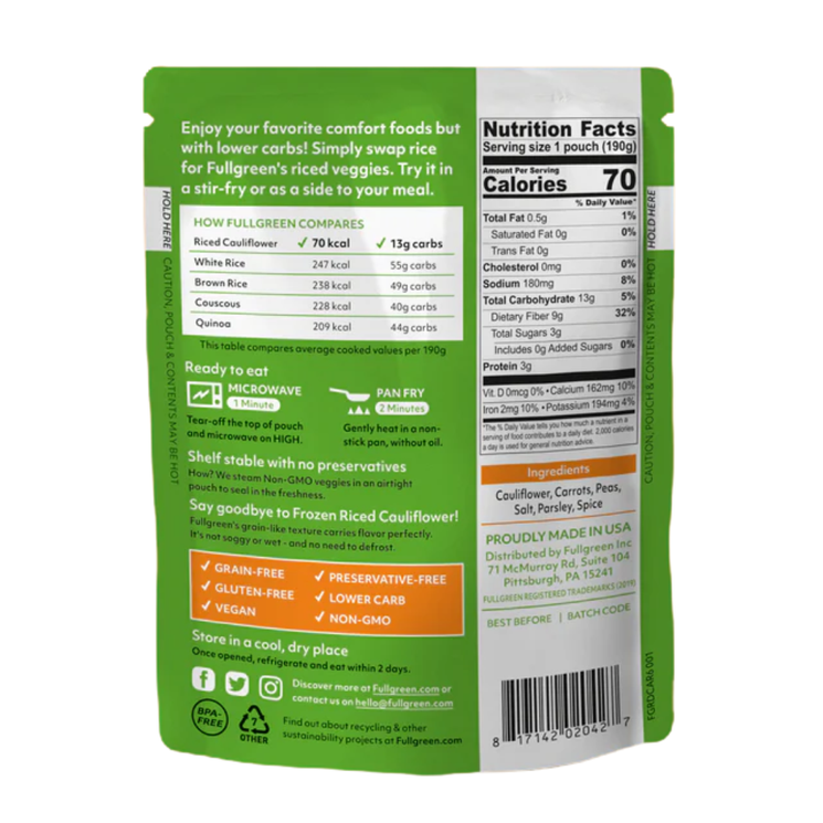 Fullgreen Riced Cauliflower with Carrots & Peas is a convenient, veg packed swap for rice that fits easily into busy, healthy lifestyles. Made simply from cauliflower, carrots and peas, it offers a light, satisfying base for meals without the heaviness of grains. With no preservatives or additives and zero prep required, this shelf stable pouch is perfect for cupboards, gym bags or desks. Use it in stir fries, as a side dish, or anywhere you’d normally reach for rice especially with Mexican or Spanish inspired flavours.