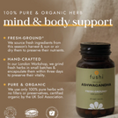 Fushi Organic Ashwagandha Capsules are freshly ground in small batches from sustainably sourced roots to deliver optimal freshness and potency. Known as one of Ayurveda’s most revered herbs, Ashwagandha has been used for centuries as a rasāyana a rejuvenating tonic to promote vitality, longevity, and inner calm.