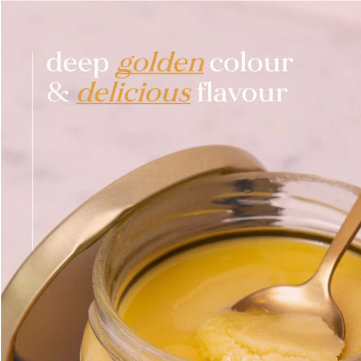 Rich in fat-soluble vitamins A, E, and K, this pure ghee is not only a nourishing cooking staple but also a versatile natural remedy. Its high smoke point makes it perfect for frying, roasting, or baking, while its soothing qualities mean it can also be used to moisturise and protect the skin.