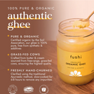 Fushi Organic Grass Fed Ghee is crafted from the finest organic butter, slowly simmered to remove milk solids and water, leaving behind a golden, nutrient rich clarified butter. Rooted in ancient Ayurvedic tradition, ghee has long been celebrated as both a food and a natural wellness aid, valued for supporting digestion, vitality, and balance.