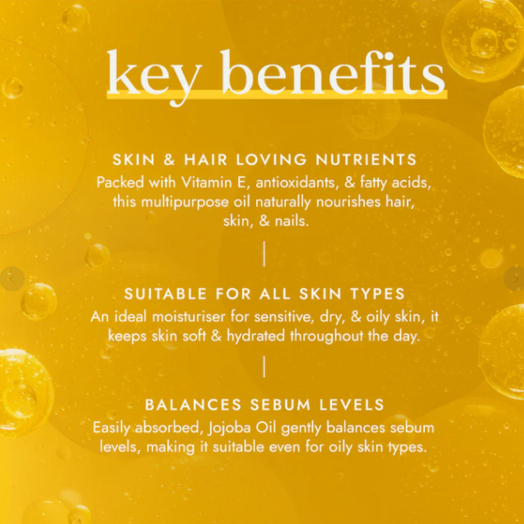 Known for its balancing properties, jojoba oil is ideal for hydrating dry skin, soothing the scalp, and nourishing hair. Its lightweight texture absorbs quickly without clogging pores, leaving skin smooth, hair shiny, and nails strengthened.