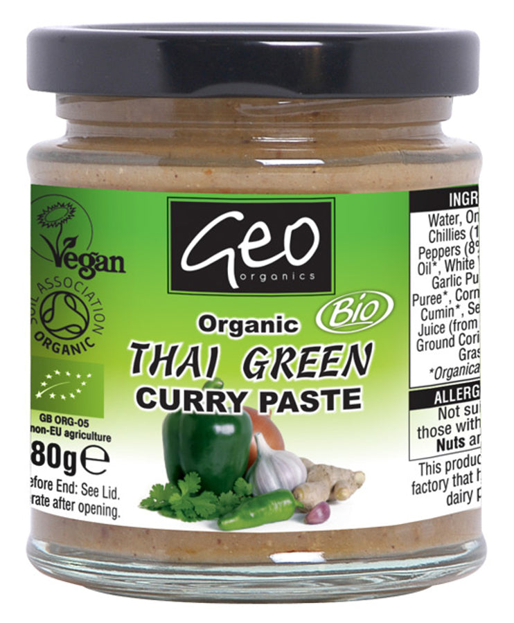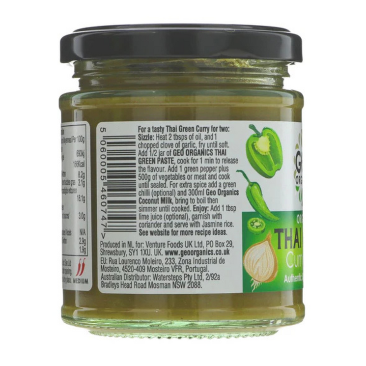 Geo Organics Organic Thai Green Curry Paste is a vibrant blend of green chillies, peppers, garlic, and aromatic spices that delivers the authentic taste of Thai cuisine. With ginger, coriander, cumin, and a hint of lemongrass, this paste balances heat with freshness for a classic green curry flavour.