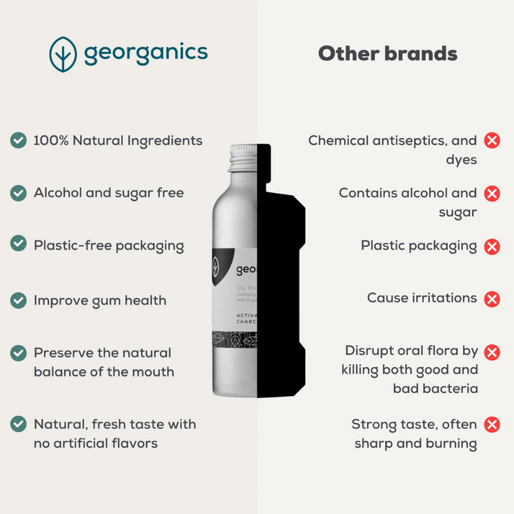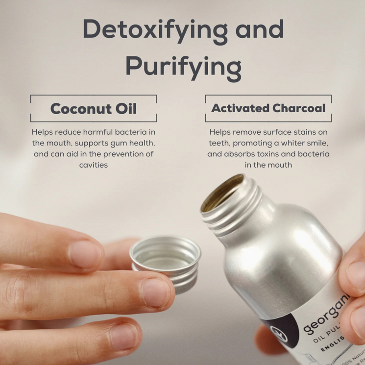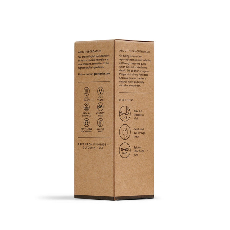 Georganics Activated Charcoal Oil Pulling Mouthwash is inspired by the ancient Ayurvedic practice of oil pulling, designed to naturally support oral health. Made with organic coconut oil, sunflower oil, and peppermint oil, it works to draw out impurities, freshen breath, and leave the mouth feeling clean.