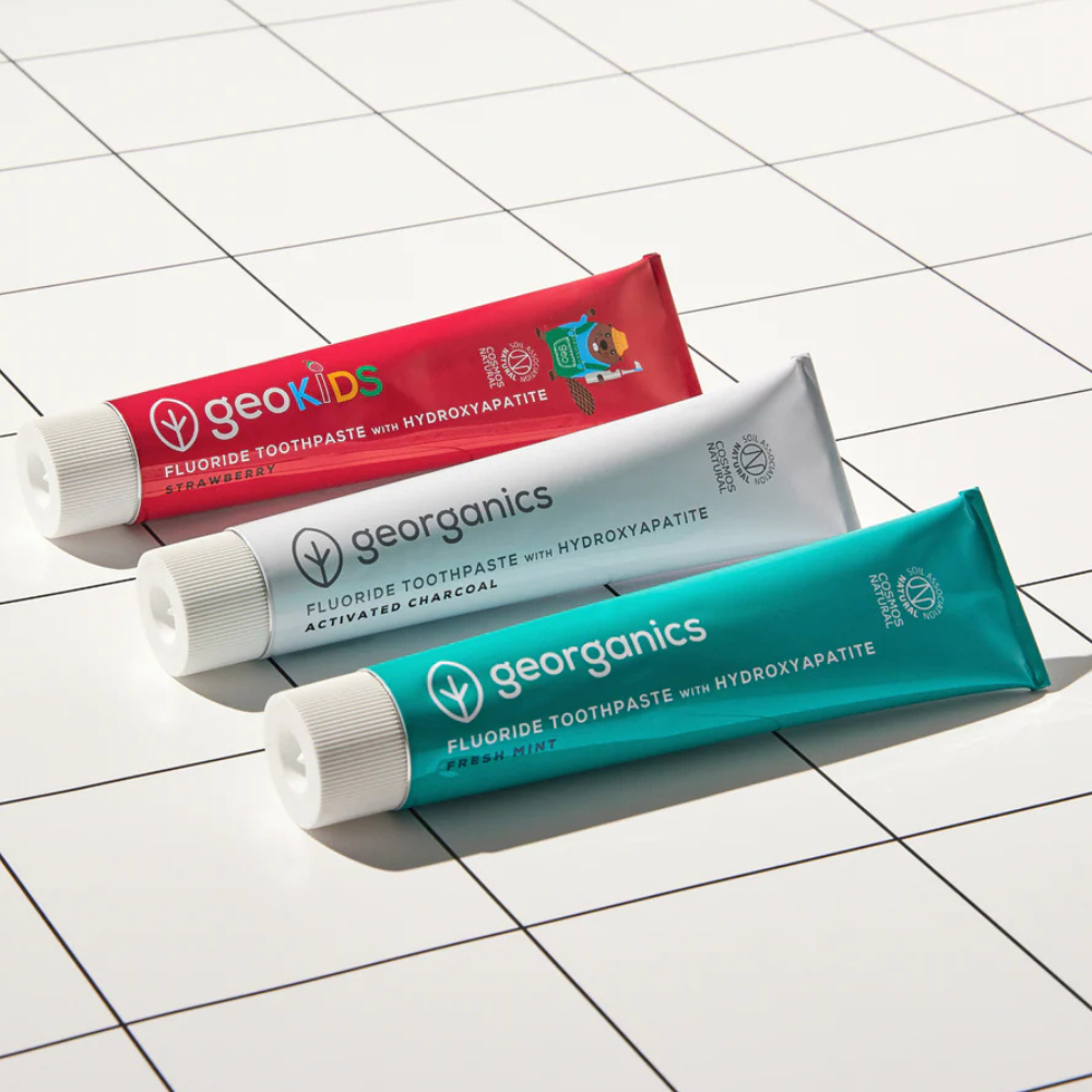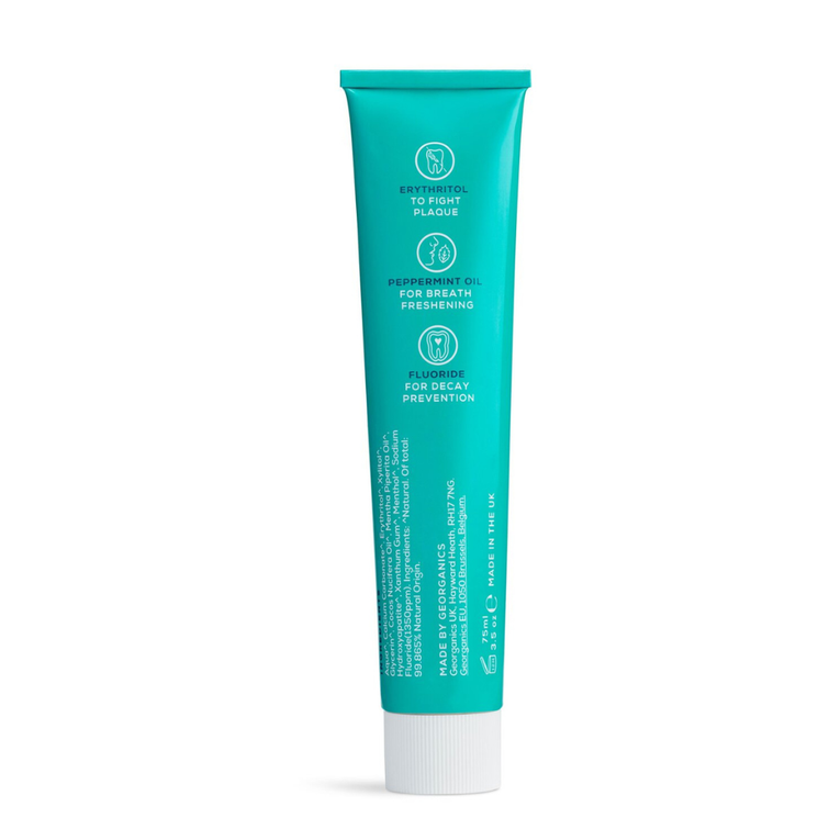 Meet your next generation toothpaste Georganics Fresh Mint Toothpaste with Hydroxyapatite and Fluoride. This advanced formula combines science and sustainability to deliver superior oral care. Hydroxyapatite works to remineralise enamel, while fluoride provides an extra layer of protection against cavities. Erythritol supports a healthy balance of bacteria in the mouth, helping to naturally reduce plaque buildup.