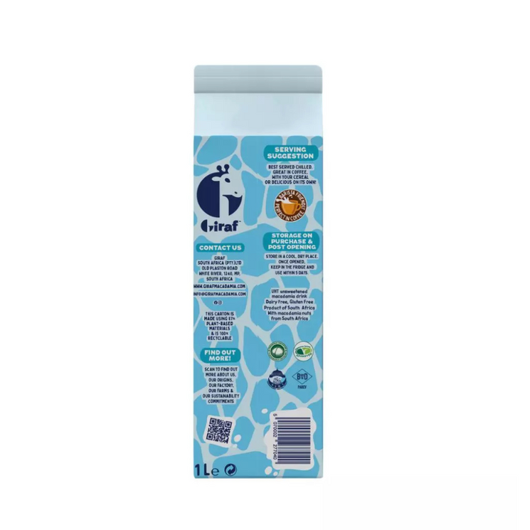 Giraf Macadamia Unsweetened Milk delivers a clean, pure taste of macadamia without any added sugars or sweeteners. Smooth and neutral, it’s the ideal unsweetened dairy alternative for anyone following a plant-based, low-carb, or keto-friendly diet.