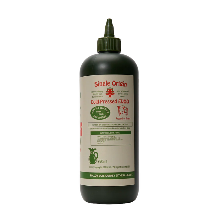 Glug Extra Virgin Olive Oil for Drizzling is a premium, single origin oil crafted exclusively from Picual olives grown in Jaen, Spain the heartland of world class olive oil. The olives are picked early in the season and cold-extracted within hours, using purely mechanical methods to protect their natural antioxidants and robust flavour profile.