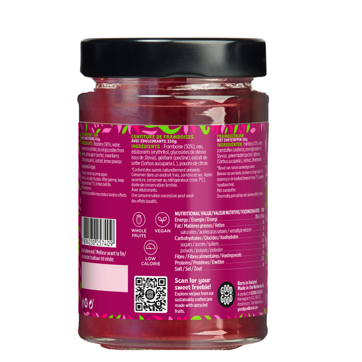 Good Good Raspberry Stevia Jam is a healthier alternative to traditional jams, made with half fruit and naturally sweetened using stevia and erythritol. With its vibrant raspberry flavour and smooth texture, it’s the perfect spread for those who want a naturally sweet taste without added sugar.