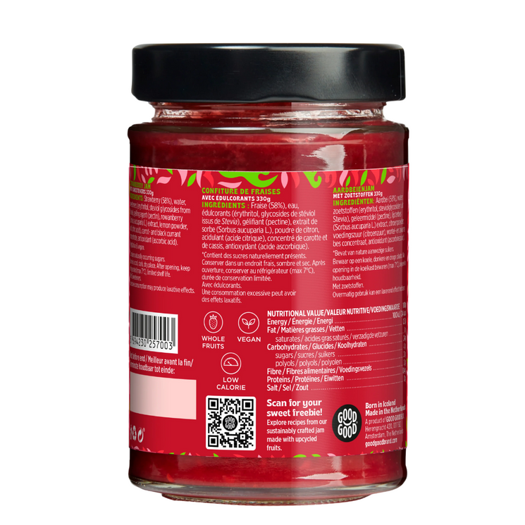 Strawberry (58%), Water, Sweeteners (Erythritol, Steviol Glycosides from Stevia), Gelling Agent (Pectin), Rowanberry (Sorbus aucuparia L.) Extract, Lemon Powder, Acid (Citric Acid), Carrot & Blackcurrant Concentrate, Antioxidant (Ascorbic Acid).