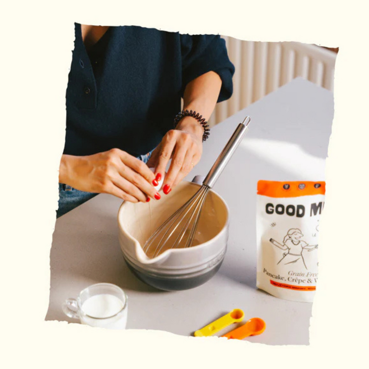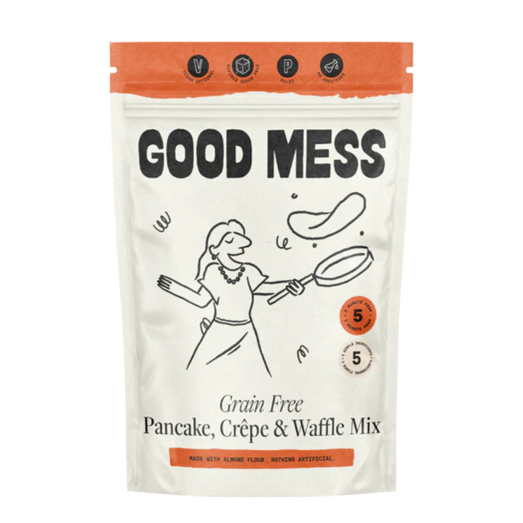 Good Mess Pancake Mix makes it effortless to whip up delicious, wholesome pancakes, crêpes or waffles without the fuss. Made from a clean blend of almond flour, tapioca flour and natural raising agents, it’s designed for quick preparation while keeping ingredients simple and nourishing.