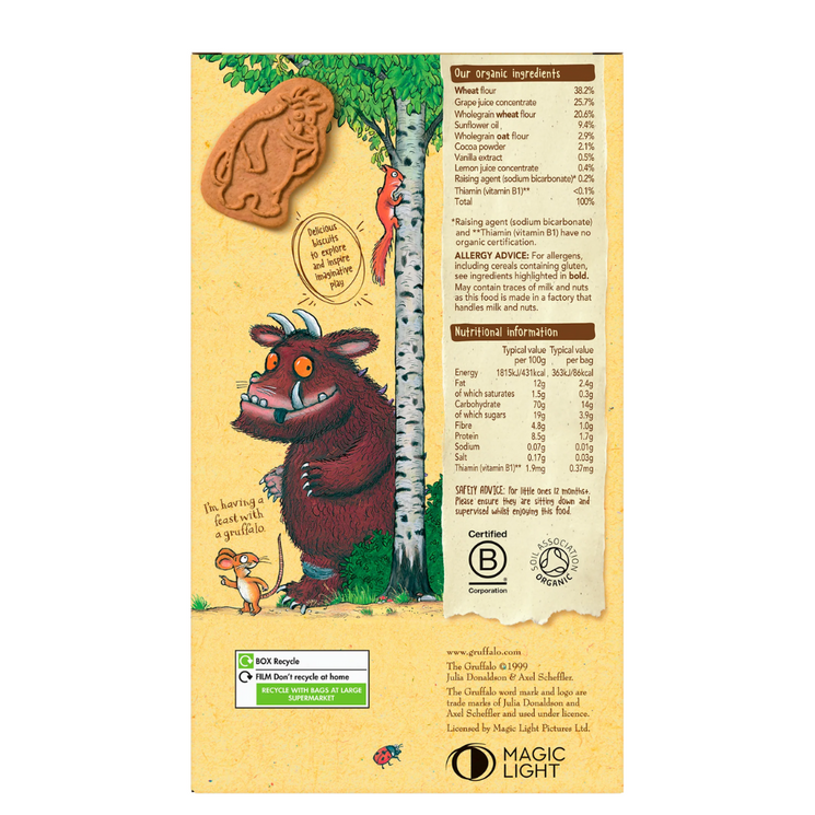 These delightful cocoa and vanilla biscuits are crafted especially for little hands and tummies, with organic ingredients and no nasties. Naturally sweetened with fruit juice, they’re a feel-good snack both kids and grown-ups can love. With their adorable Gruffalo shapes and wholegrain goodness, they’re perfect for lunchboxes, picnics, or a story-time treat.