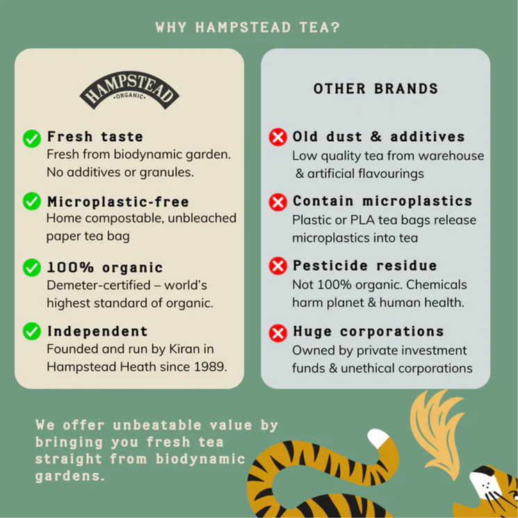 This premium Darjeeling green tea is sourced from biodynamic farms where soil health and biodiversity are at the heart of every harvest. Hampstead Tea goes beyond standard organic practices, nurturing the earth and supporting local ecosystems while delivering a smooth, flavourful green tea. Each bag is fully home compostable and biodegradable, helping to reduce plastic waste. Enjoy a cup that’s as good for the planet as it is for you.