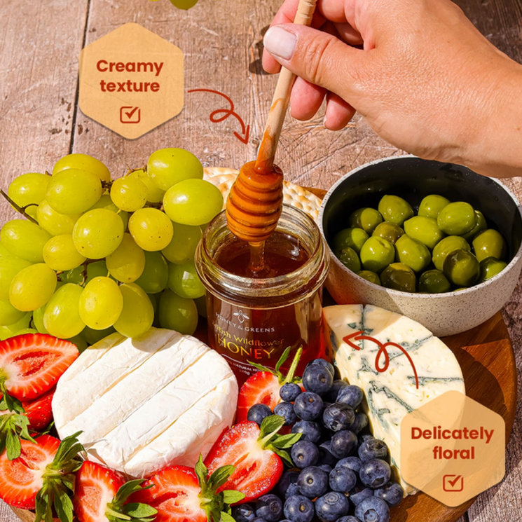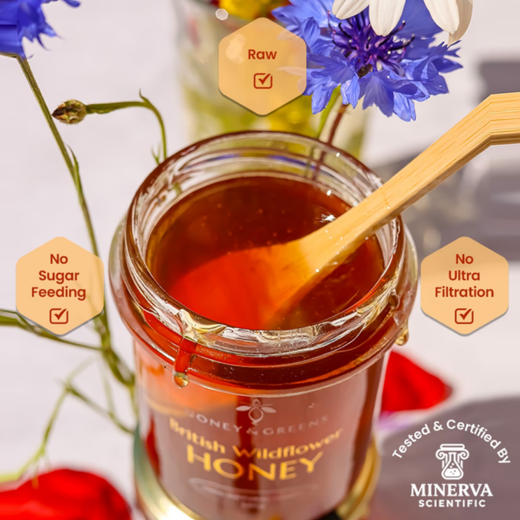 Honey & Greens British Wildflower Honey is produced by bees foraging across the diverse wildflowers of rural Staffordshire. This carefully harvested honey captures the natural character of the landscape, delivering a smooth, creamy texture and a delicate floral sweetness with subtle fruity notes. Each jar is fully traceable from hive to jar and undergoes independent laboratory testing to ensure authenticity and purity. With no added sugars and no feeding of sugar solutions to bees, this honey reflects the natural richness of wildflower nectar perfect stirred into tea, drizzled over porridge, or enjoyed straight from the spoon.