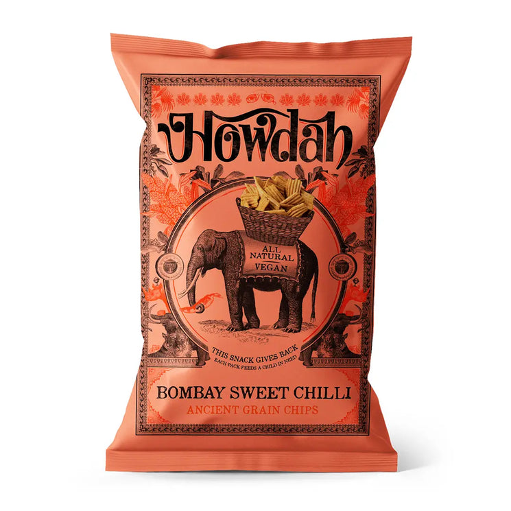 Howdah Bombay Sweet Chilli Ancient Grain Chips are a vibrant twist on snacking, inspired by the rich flavours of Indian street food. Crafted with sorghum flour and chickpea flour, these chips combine traditional grains with a fiery seasoning blend that includes chilli, garlic, and warming tandoor spices.