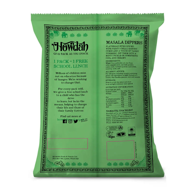 Howdah Masala Dippers Flatbread Bites are a celebration of flavour and crunch. Made with wheat flour, sesame, and rice flour, they’re carefully seasoned with cumin, chilli, turmeric, and warming spices for an authentic Indian-inspired snack.
