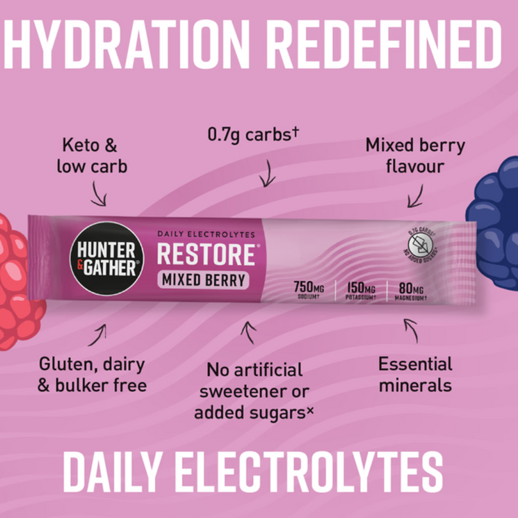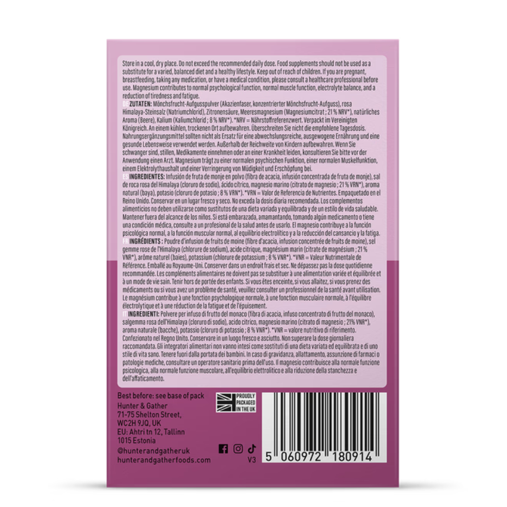 Hunter 7s Berry is a clean and effective hydration solution designed to help replenish electrolytes and support your body throughout the day. With a refreshing natural berry flavour, each sachet blends Himalayan rock salt, marine magnesium, and potassium three essential minerals that support hydration, muscle function, and recovery.