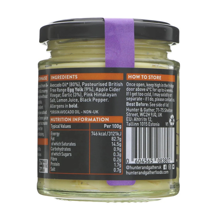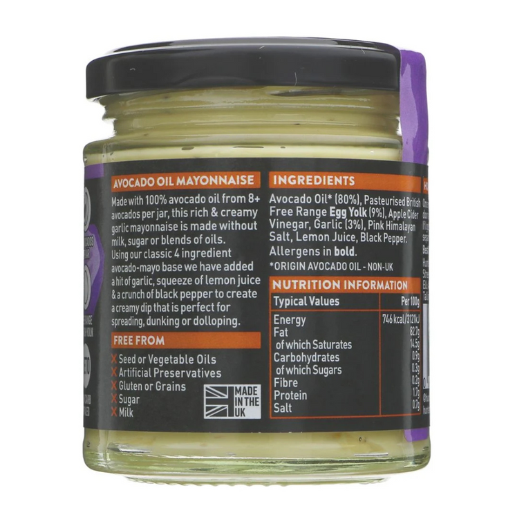 Avocado Oil (80%)*, Pasteurised British Free-Range Egg Yolk (9%), Apple Cider Vinegar, Garlic (3%), Pink Himalayan Salt, Lemon Juice, Black Pepper.