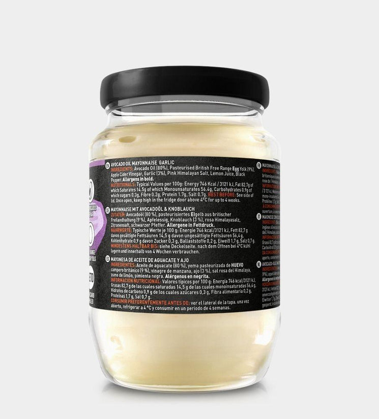 Avocado Oil (80%), Pasteurised British Free Range Egg Yolk (9%), Apple Cider Vinegar, Garlic (3%), Pink Himalayan Salt, Lemon Juice, Black Pepper.