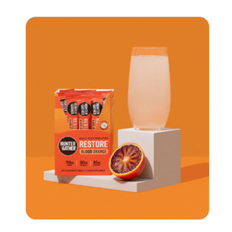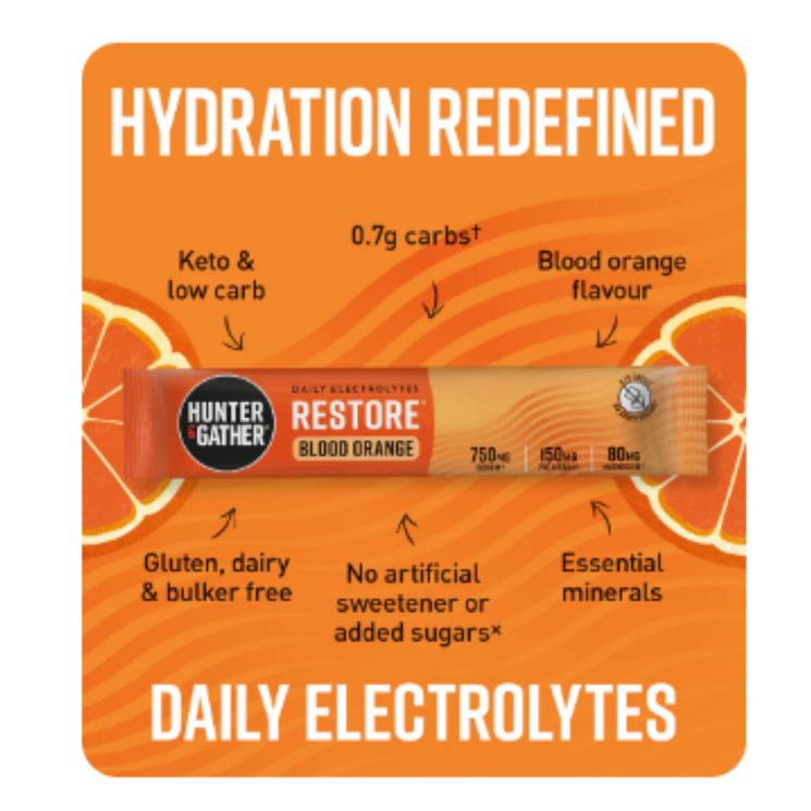 Stay naturally energised and hydrated with Hunter & Gather’s Blood Orange Electrolyte Restore blend. This refreshing daily electrolyte formula contains a potent mix of sodium, potassium, and magnesium, plus a dash of citrusy flavour from real blood orange. With zero sugar and no artificial additives, it’s designed to fit seamlessly into your healthy routine whether you're fasting, working out, or simply powering through a busy day.