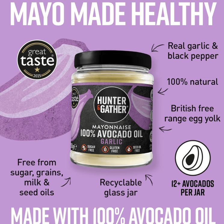 This creamy, flavour rich mayonnaise is made using 100% avocado oil, giving it a velvety texture and a beautifully clean, natural profile. Infused with garlic for a warm, aromatic depth, it's crafted from only a handful of real food ingredients no seed oils, no added sugar and no artificial chemicals.