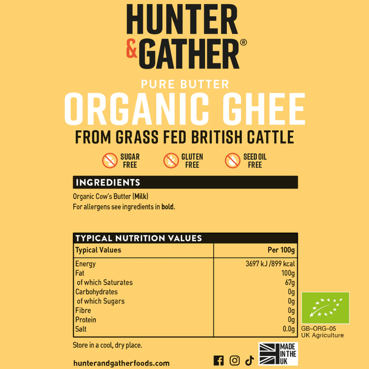 Hunter & Gather’s organic ghee is produced in the UK from certified organic, grass-fed dairy herds, ensuring quality, animal welfare and a naturally nutrient dense result. Its pure, buttery flavour and versatility make it a staple for anyone seeking clean, traditional cooking fats without seed oils or artificial additives.