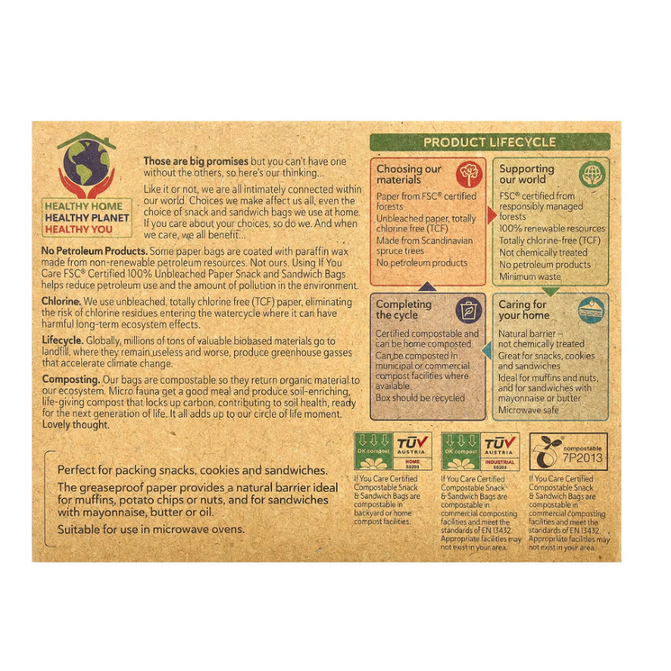 If You Care Sandwich Bags are a simple, sustainable solution for lunch boxes, food storage, and snacking on the go. Made in Sweden using pulp from Scandinavian spruce trees a renewable resource these bags are greaseproof and completely free from petroleum based paraffin wax or any other chemical coatings. They are totally chlorine-free, ensuring no harmful chlorine is released into the environment during production. Perfect for everyday use, these bags keep your food fresh while helping to protect our planet.