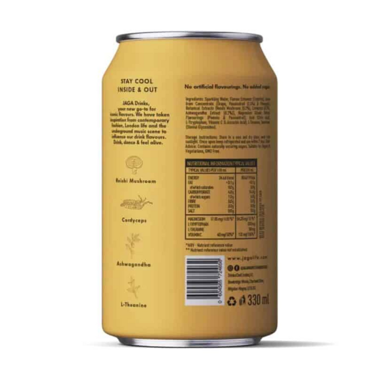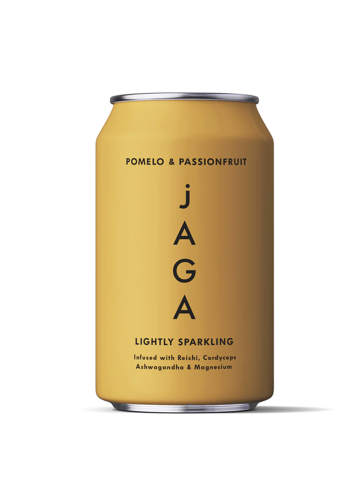 jAGA Pomelo Passionfruit is a refreshing nootropic soda made for moments when you want more from your drink. Zesty pomelo and sweet passionfruit are lifted by pineapple juice and a touch of lime and mint, all supported by functional botanicals. This clean, sparkling drink blends reishi and cordyceps mushrooms with ashwagandha, magnesium and amino acids to provide an uplifting yet calming option. Perfect as a mindful alternative to alcohol or a sophisticated soft drink, all packaged in 100% recyclable cans.