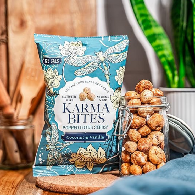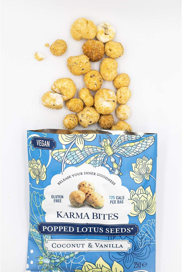 Karma Bites Coconut & Vanilla Popped Lotus Seeds are a naturally light, crunchy snack made from the seeds of the Euryale ferox (water lily). Popped like popcorn, then coated in creamy coconut and aromatic vanilla, they deliver a subtly sweet and satisfying flavour.