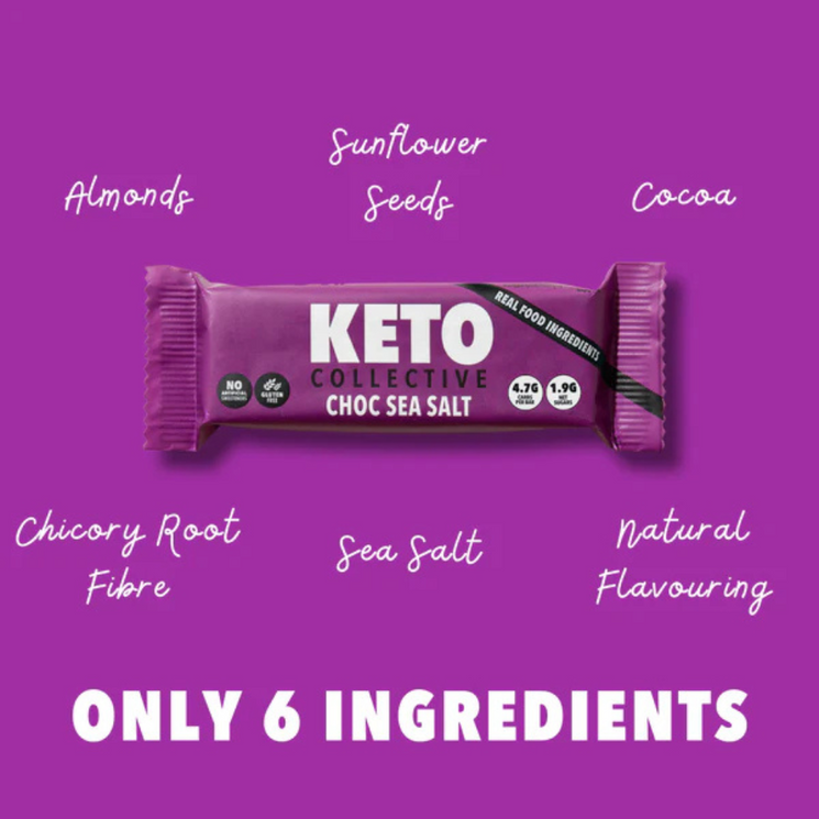 Keto Collective Choc Sea Salt Keto Bars combine crunchy almonds and sunflower seeds with cocoa and a pinch of sea salt for a decadent yet clean snack. Naturally flavoured with vanilla and bound together with chicory root fibre, these bars are satisfying without being heavy.