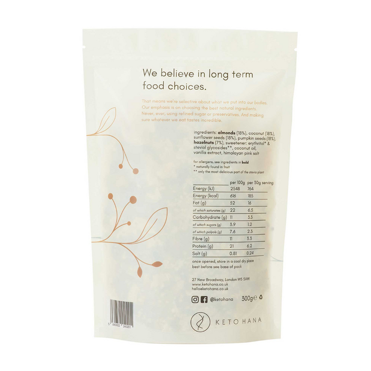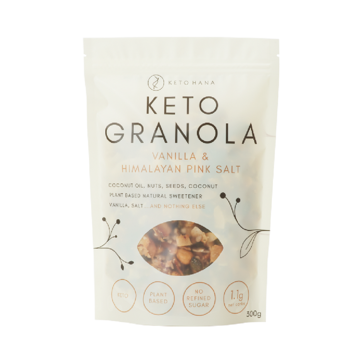 Keto Hana Vanilla & Pink Salt Granola is a perfectly balanced mix of nuts, seeds, and coconut, lightly sweetened with erythritol and stevia. The delicate vanilla flavour is enhanced by Himalayan pink salt, giving it a unique sweet savoury twist.