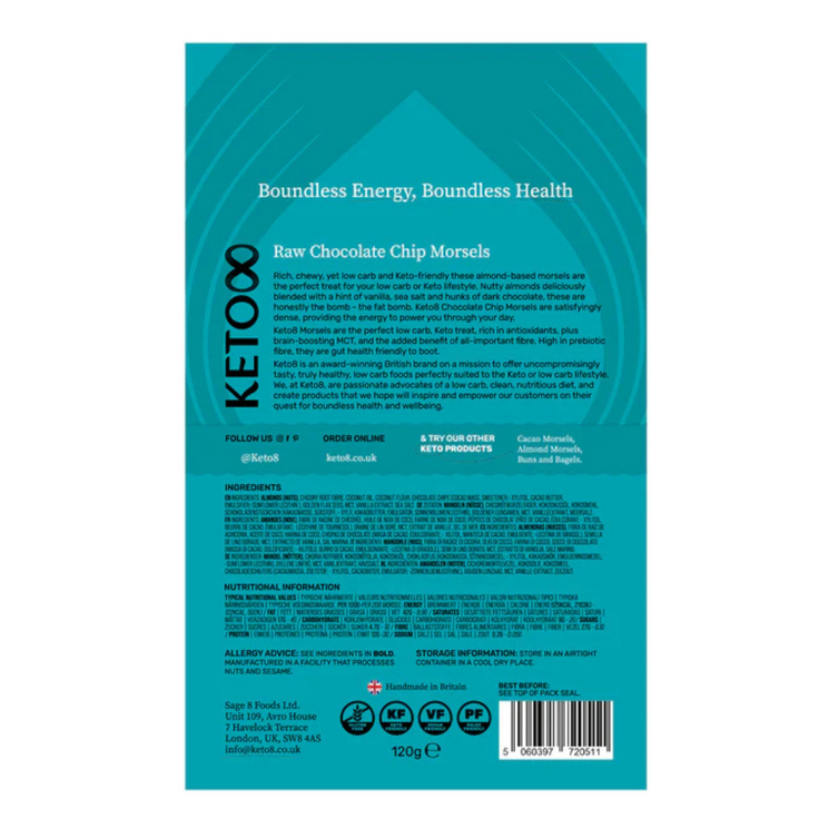 Keto8 Chocolate Chip Morsels are indulgent bite-sized snacks made with nutrient dense ingredients like almonds, coconut flour, and golden flaxseed. Enriched with MCT oil and sweetened naturally with xylitol, these morsels offer a clean, chocolatey flavour while staying low-carb.