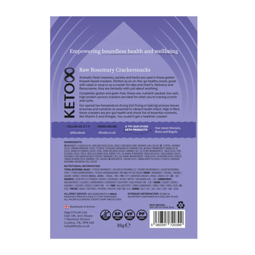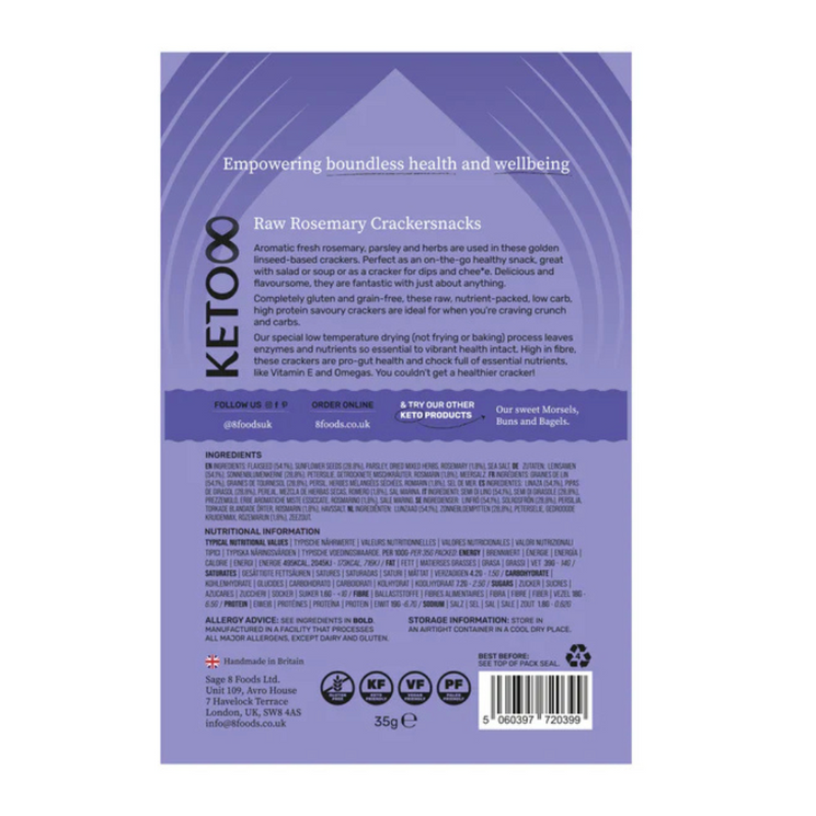 Keto8 Rosemary Cracker Snacks are handcrafted from a nutritious blend of golden linseed, sunflower seeds, parsley, and fragrant herbs. With 1.8% rosemary and a classic herbs de Provence seasoning, they deliver a crisp, savoury bite with a Mediterranean twist.
