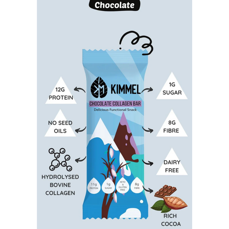 Indulge in your daily dose of goodness with this decadent chocolate collagen bar from Kimmel. Crafted with premium bovine collagen and real cacao, this bar delivers both flavour and function. Whether you’re on-the-go or refuelling after a workout, this bar supports your glow and satisfies your chocolate cravings all without compromise.