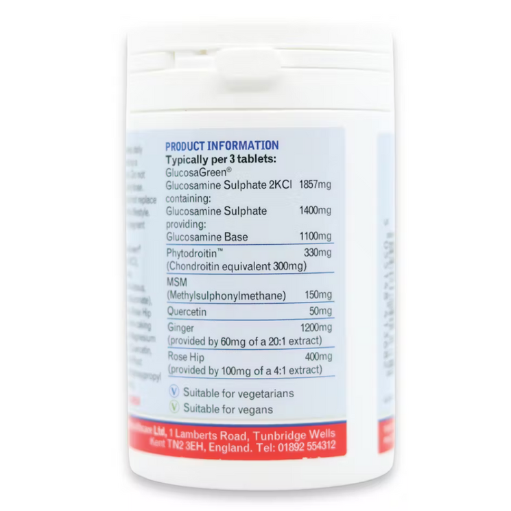 GlucosaGreen® (Glucosamine Sulphate 2KCl) (providing 1400mg Glucosamine Sulphate, yielding 1100mg Glucosamine base), Phytodroitin™ (from Fucus vesiculosus, Ulva lactuca, Sodium Hyaluronate), Methylsulfonylmethane (MSM), Quercetin, Ginger Extract (from 60mg of a 20:1 extract, equivalent to 1200mg Ginger), Rose Hip Extract (from 100mg of a 4:1 extract, equivalent to 400mg Rose Hip), Modified Starch, Cellulose, Silicon Dioxide, Magnesium Stearate, Stearic Acid, Hydroxypropyl Methylcellulose, Glycerin.