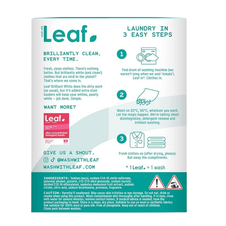 Leaf White Detergent Sheets are designed to give your whites a brighter, cleaner wash in a simple, sustainable way. Each sheet provides the same cleaning power as a scoop of powder or tablet, but without the bulk, waste, or plastic. Simply pop one directly into the drum with your laundry for fresh, bright results.