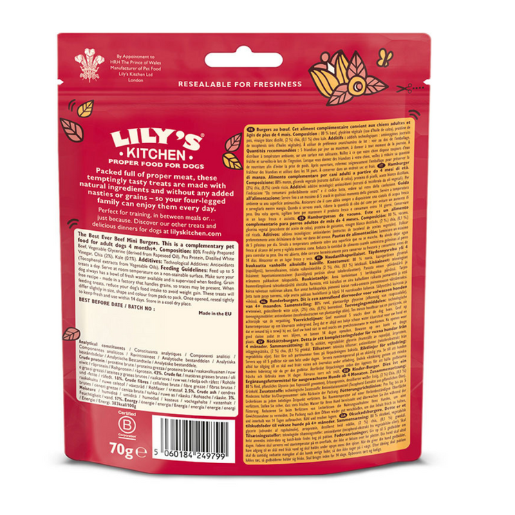 Lily’s Kitchen Best Ever Mini Beef Burgers are the ultimate tasty reward for your four legged friend. Made with freshly prepared beef, nutritious chia seeds, and kale, these bite sized treats are grain free and packed with natural goodness.