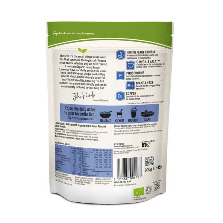 Linwoods Organic Milled Hemp Seed with Flax & Chia Seeds is a powerful combination of super seeds designed to fuel an active lifestyle. Hemp seeds provide plant based protein and essential omega fatty acids, while flax and chia seeds add fibre and further nutritional benefits.