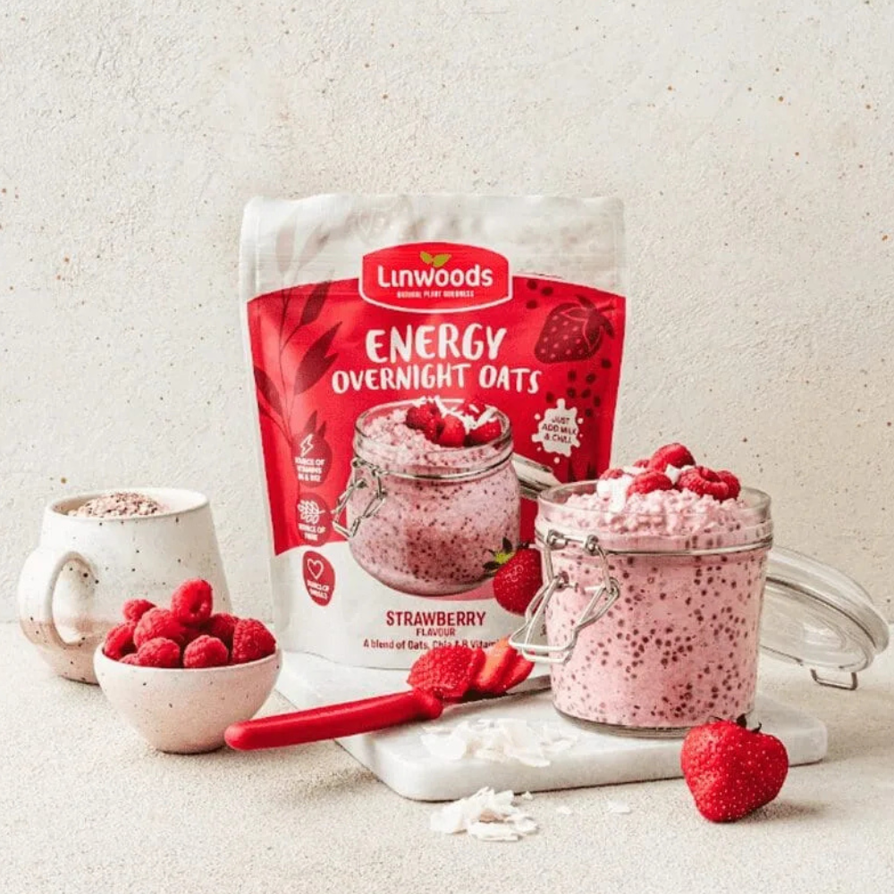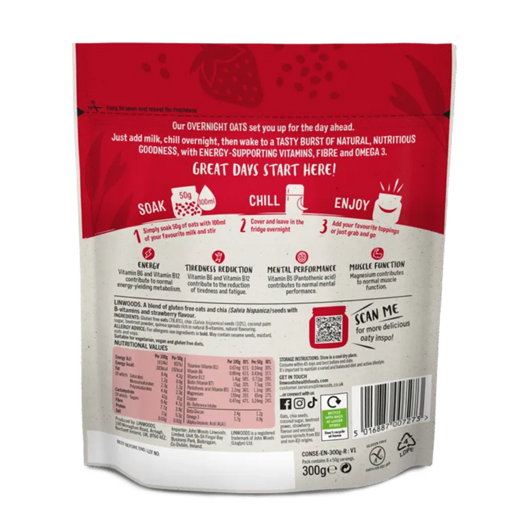 Linwoods Overnight Oats Strawberry Energy is a fruity, nourishing breakfast blend made with gluten free oats, chia seeds, and coconut palm sugar, combined with quinoa sprouts rich in natural B-vitamins to support energy metabolism.