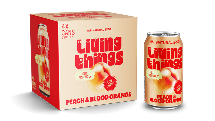 Living Things Soda Peach & Blood Orange is a refreshing, functional soda crafted with 13% peach juice concentrate and a splash of blood orange extract for a naturally sweet, tangy taste. With added chicory root inulin and live probiotics, this is a gut-friendly drink that combines great flavour with functional benefits.