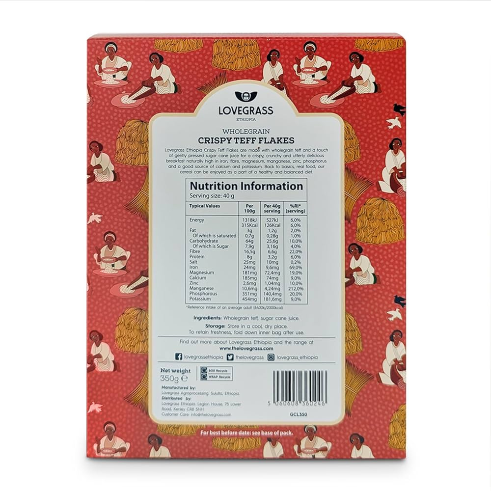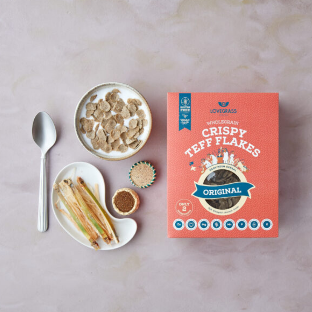 Lovegrass Ethiopia Crispy Teff Flakes are a wholesome, nutrient-packed breakfast cereal made from wholegrain teff an ancient Ethiopian grain celebrated for its impressive nutritional profile. A touch of gently pressed sugar cane juice creates a naturally sweet crunch that makes these flakes both nourishing and satisfying.