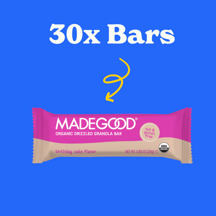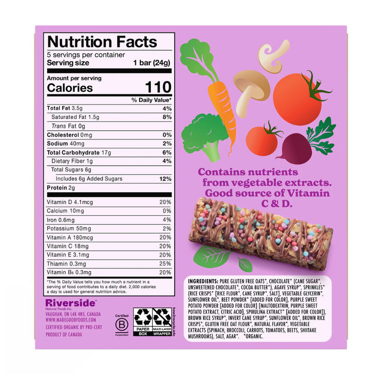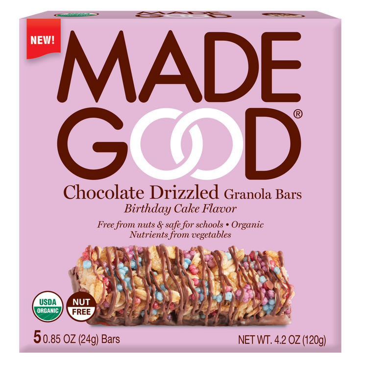 Celebrate snack time with MadeGood’s Birthday Cake Drizzled Granola Bars a joyful blend of chewy organic oats, natural sprinkles, and a sweet chocolate drizzle. Beyond their delicious flavour, each bar sneaks in nutrients from six vegetables including spinach, broccoli and carrots, making them a better for you treat the whole family can enjoy.