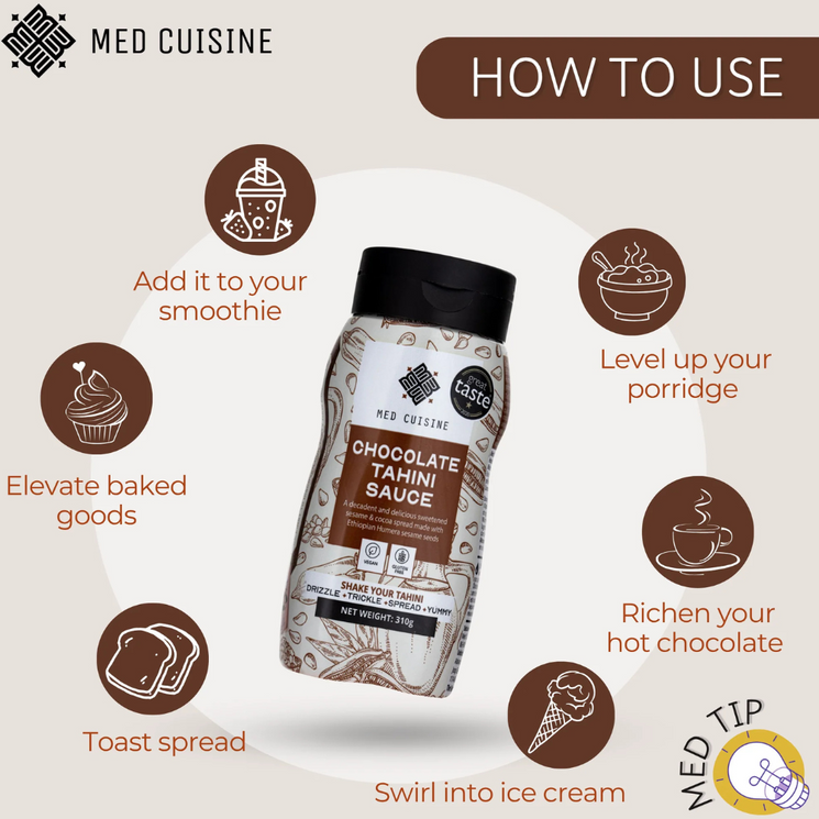 Med Cuisine Chocolate Tahini is an award winning blend of premium sesame seeds, cocoa and natural sweeteners, delivering a velvety, indulgent flavour. Using double ground Humera sesame seeds for depth and creaminess, it’s perfectly balanced between nutty richness and chocolatey sweetness.