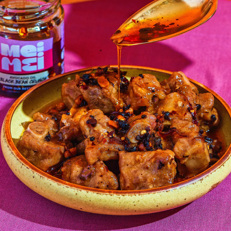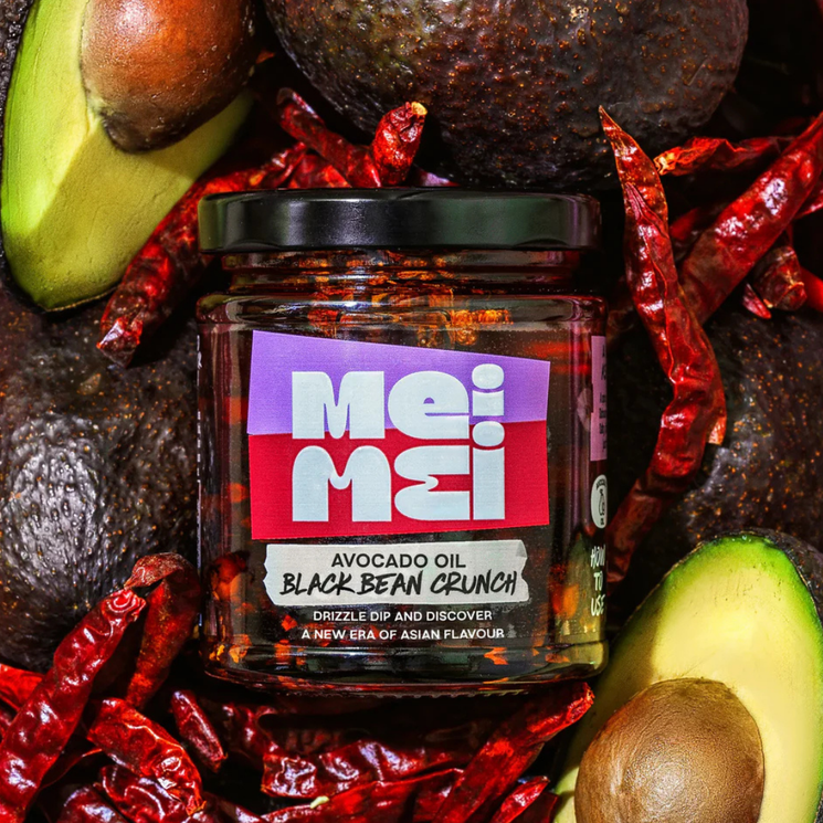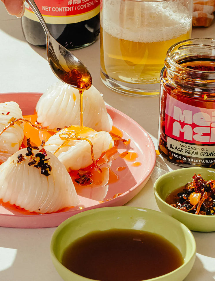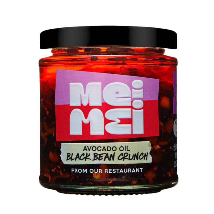 Mei Mei Black Bean Crunch takes the classic Cantonese black bean chilli oil and gives it a deliciously modern twist. Fermented black soybeans bring rich savoury depth, while fiery chillies and aromatic spices add warmth and complexity. The addition of roasted fava beans and soybeans creates an irresistible crunchy texture that transforms every spoonful into a flavour packed experience. Designed as a versatile cooking companion, this bold condiment instantly elevates simple dishes. Stir it through noodles or rice, spoon it over steamed vegetables or use it as a punchy topping for eggs, prawns or toasties. Inspired by a family recipe and refined by a chef’s touch, it delivers vibrant flavour and satisfying texture in every bite.
