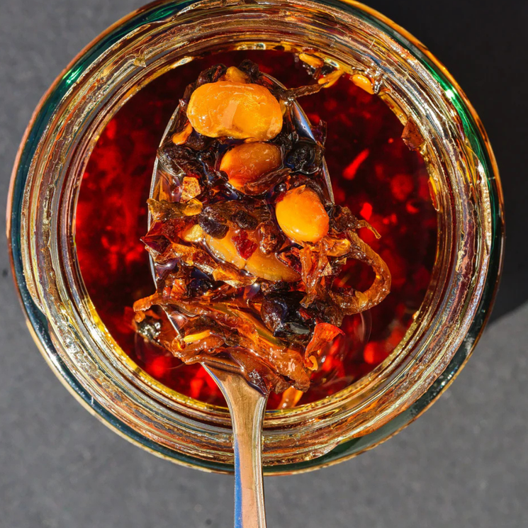• Bold Cantonese inspired black bean chilli oil with crunchy texture