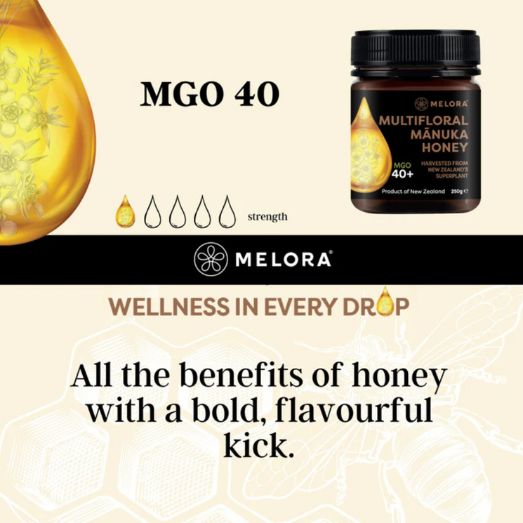 Melora Manuka Honey 40+ MGO is a versatile, everyday honey made from a blend of nectar collected by bees from Manuka and other native New Zealand flora. Certified for purity and quality, this honey contains 40+ MGO (Methylglyoxal) a naturally occurring compound that gives Manuka honey its special properties.