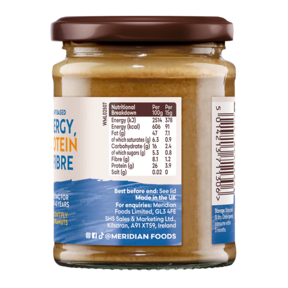 Meridian’s smooth peanut butter is made with just one ingredient: whole roasted peanuts, ground to a satisfyingly smooth texture. With no added sugar, palm oil or salt, it's packed with natural protein and healthy fats perfect for fuelling your day. Spread it, stir it or bake with it it’s a clean, versatile cupboard essential.