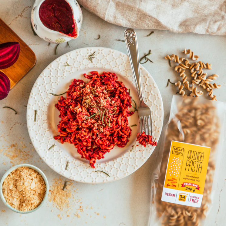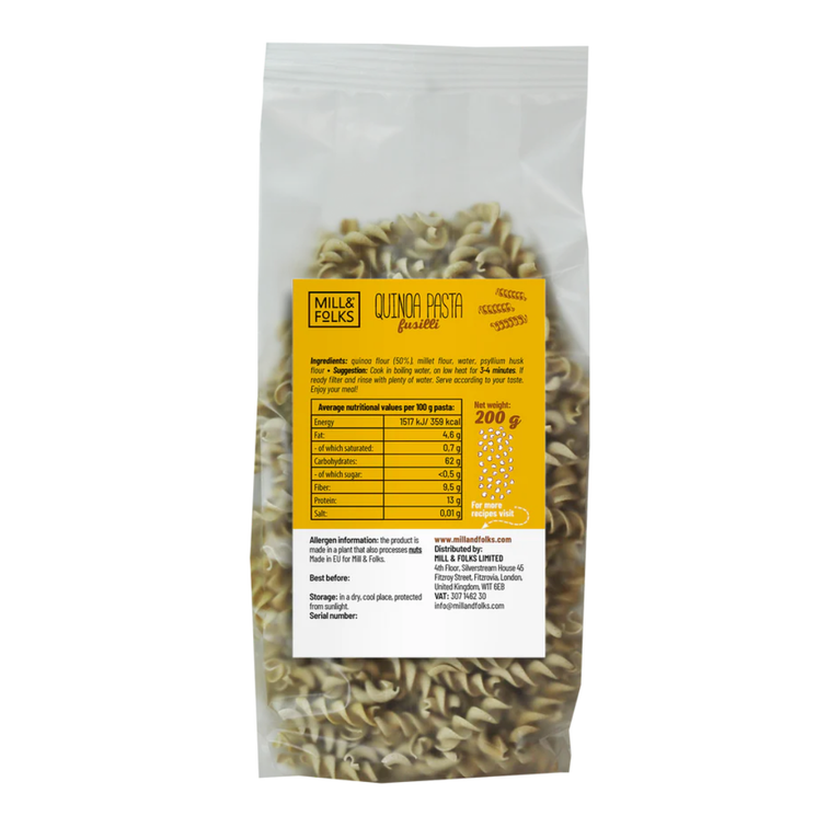 Mill & Folks Quinoa Pasta Fusilli is a gluten-free pasta made from quinoa and millet flour, offering a naturally mild flavour and a firm texture that holds well during cooking. Quinoa, traditionally grown in South America, has long been valued as a staple grain and continues to be widely used in plant based cooking today. The spiral fusilli shape helps capture sauces and ingredients, making it suitable for a variety of pasta dishes. Whether served with vegetables, rich tomato sauces or light dressings, this pasta offers a simple and versatile option for gluten free and plant based meals.