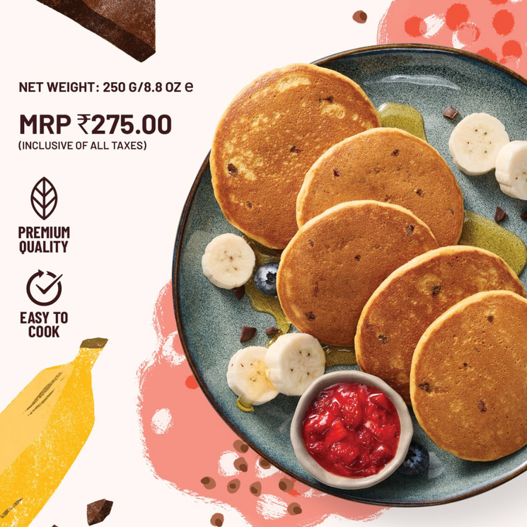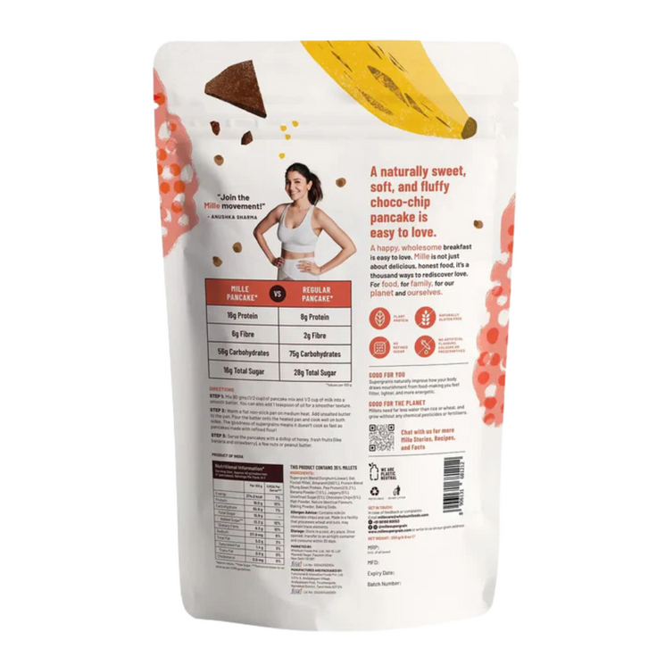 Sweeten up your breakfast routine with Mille’s Banana Choco Chip Millet Pancake Mix. Crafted with nutrient rich millets, plant protein, and indulgent chocolate chips, this mix strikes the perfect balance between nourishment and indulgence. The natural banana flavour adds a fruity note, making every bite wholesome and comforting.