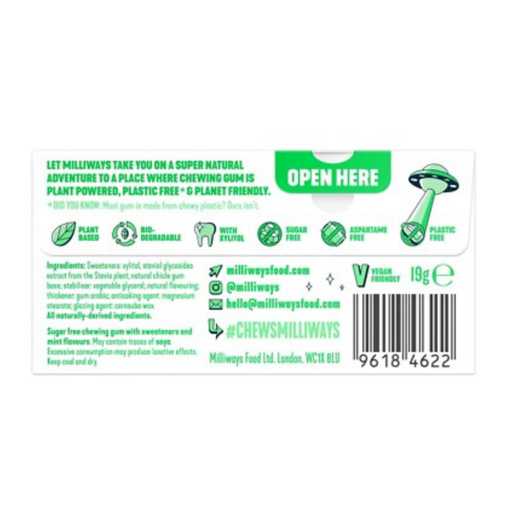 Milliways Mighty Mint takes chewing gum back to its natural roots. Crafted with a plant-based, biodegradable gum base made from natural chicle, it offers a refreshing minty flavour without the hidden plastics or artificial nasties found in conventional gums.