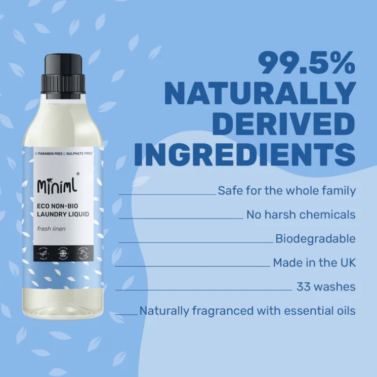 Miniml Natural Laundry Liquid Fresh Linen is a powerful yet gentle non bio detergent that keeps your clothes clean, soft, and naturally fresh. Formulated with biodegradable surfactants derived from plants and minerals, it removes dirt and stains effectively while being kind to skin and the planet.