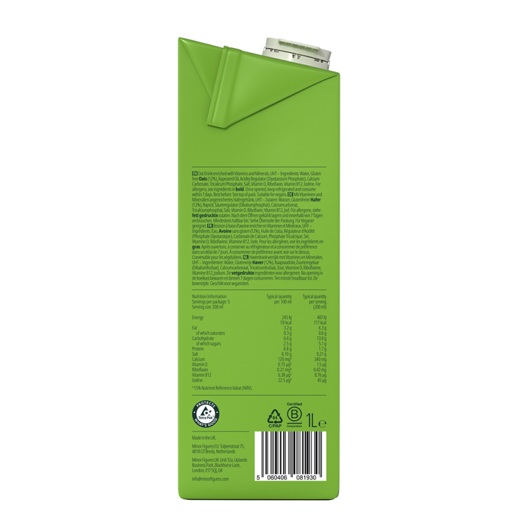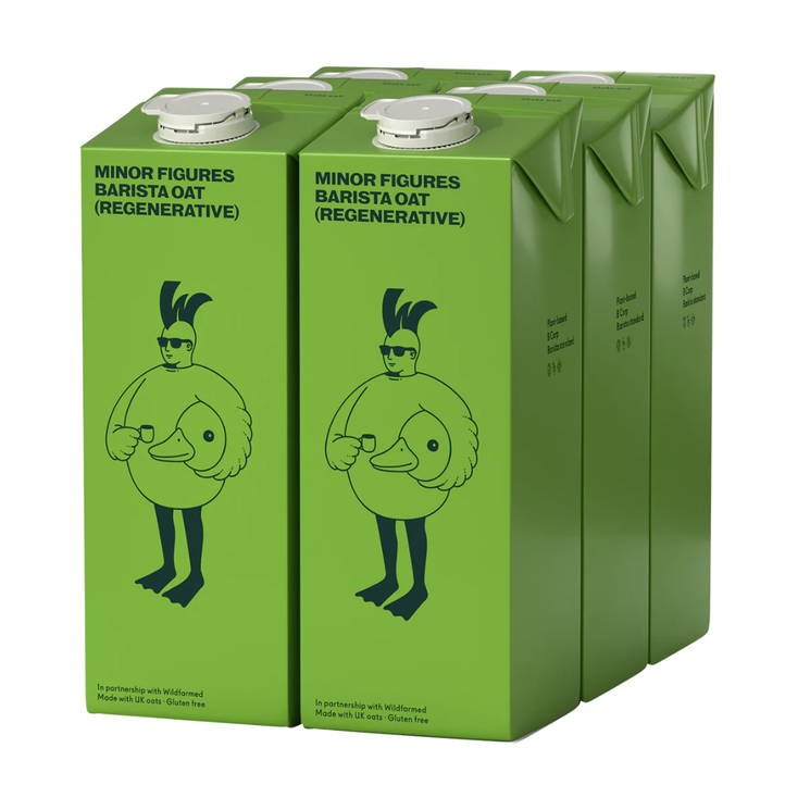 Minor Figures Barista Oat (Regenerative) is crafted in harmony with nature to deliver smooth texture and reliable performance in coffee. Developed specifically for baristas, it steams beautifully and complements espresso with a creamy, balanced finish. Made in partnership with Wildfarmed, the oats are regeneratively grown in the UK using farming practices that improve soil health, enhance biodiversity and help reduce carbon and water pollution. Fortified with key vitamins and minerals, it supports a balanced plant based diet while staying true to Minor Figures’ commitment to quality and sustainability.